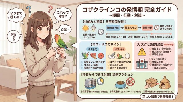 コザクラインコを飼っていると、「発情期はいつまで続くの?」「最近のこの行動は発情なの?」と戸惑いや不安を感じる飼い主さんは少なくありません。