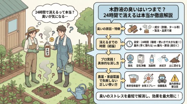 木酢液の臭いは、条件が良ければ24時間以内に軽減するケースもありますが、使い方次第では数日以上長引くこともあります。
