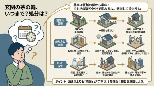 玄関に飾る茅の輪は、一般的には夏越の祓から半年を目安にしつつも、神社や地域、授与された形態によって扱い方が異なります。