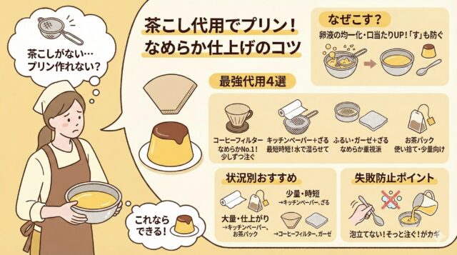 プリン作りで「茶こしがない」と気づいた瞬間、作るのを諦めてしまいそうになる方は少なくありません。