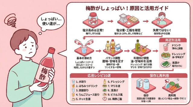 この記事では、まず梅酢がしょっぱくなる原因を分かりやすく整理し、そのうえで今日からすぐ試せる薄め方の目安や、味のバランスを崩しにくい調整のコツを丁寧に解説します。