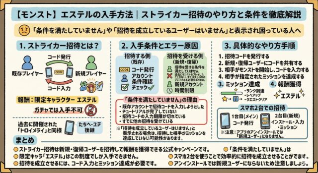 モンスターストライク(モンスト)のストライカー招待で限定キャラクター「エステル」を入手したいと考えているものの、「条件を満たしていません」や「招待を成立しているユーザーはいません」と表示され、やり方が分からず困っている方も多いのではないでしょうか。特に過去の「トロイメライ」と同様の仕組みであるため、正しい条件や手順を理解していないと招待が成立しないことがあります。本記事では、ストライカー招待の仕組みからエステルの入手条件、スマホ2台を使った具体的な方法まで分かりやすく解説します。