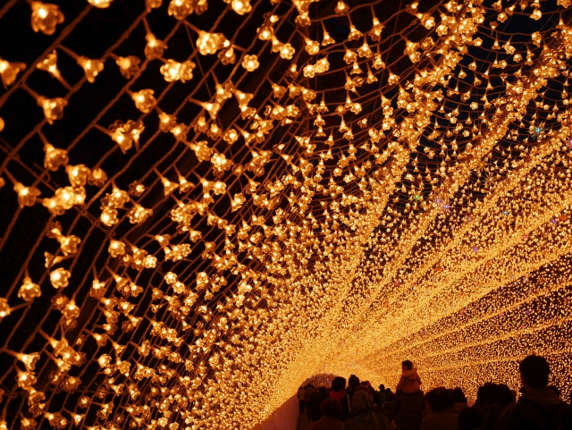 特に名物の「光のトンネル」は全長200メートルを超え、金色や白銀の光に包まれながら歩く体験はまるで別世界。