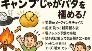 雑学 バターがとろける幸せ!キャンプ場で輝く「じゃがバター」の秘密 ホクホクのじゃがいもにバターがとろけるあの幸せな一口。子供も大人も笑顔になるキャンプ飯の定番といえば、やっぱり「じゃがバター」です。でも、外で美味しく食べるにはちょっとした下準備が鍵になります。本記事では、忙しいキャンプ当日を楽にするための... 雑学