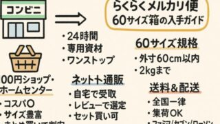 雑学 コンビニ・ダイソー・Amazonどれが最適?メルカリ60サイズ箱の購入先を徹底解説 フリマアプリ「メルカリ」で商品を出品する際、多くの人が利用するのが「らくらくメルカリ便」。その中でも60サイズは衣類や雑貨、小物など幅広いジャンルに対応できる人気サイズです。しかし初心者にとっては「箱はどこで買えばいいの?」と迷ってしまうこ... 雑学