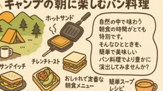 雑学 初心者でも失敗なし!キャンプで楽しむ簡単&絶品パン朝ごはん キャンプの朝は、自然の中で味わう朝食の時間がとても特別です。そんなひとときを、簡単で美味しいパン料理でより豊かに演出してみませんか?この記事では、ホットサンドやサンドイッチ、フレンチトーストなどの定番から、野菜たっぷりのおしゃれメニュー、ス... 雑学
