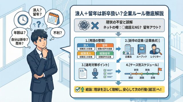 本記事では、そうした不安や誤解を整理するために、浪人・留年・就職浪人・就職留年の違いを一つひとつ丁寧に解説したうえで、浪人+留年の場合に新卒はいつまで認められるのかを、企業の採用ルールや実務視点から分かりやすく解説します。