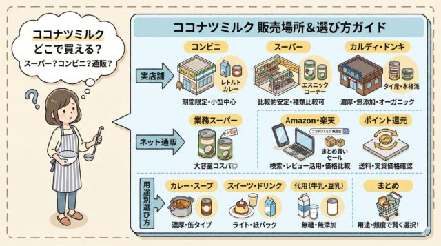 ココナツミルクを使った料理やスイーツを作りたいと思ったとき、「どこに売ってるの?」「スーパー?コンビニ?それとも通販?」と迷う方は少なくありません。