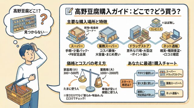 読み終えた頃には、「どこで」「どのタイプを」「どう買うのが一番お得か」が明確になり、あなたに最適な高野豆腐の購入先がすぐに分かるはずです。