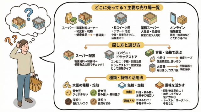 きな粉を買おうと思ったとき、「スーパーのどの売り場にあるの?」「コンビニやドラッグストアでも買える?」と迷った経験はありませんか。